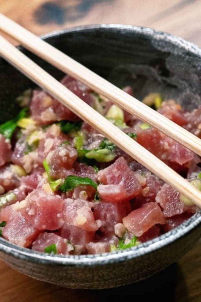 - Mix in Tuna: Add cubed ahi tuna and gently fold everything together.