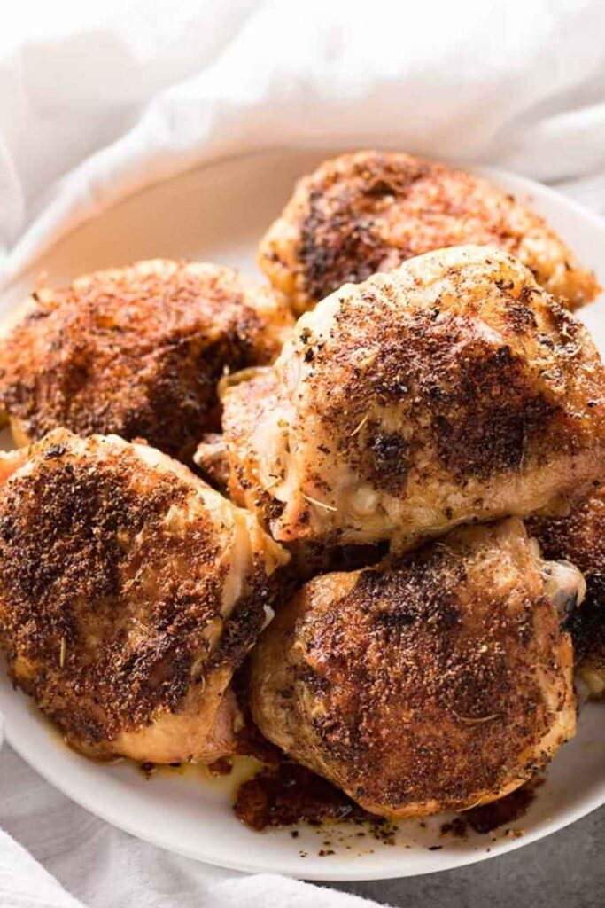 Alton Brown Baked Chicken Thighs Recipe is made with chicken thighs, olive oil, garlic powder, onion powder, Italian seasoning, salt, and paprika. This recipe creates flavorful, juicy chicken thighs with a crispy skin. It takes about 50 minutes to prepare and serves 8.