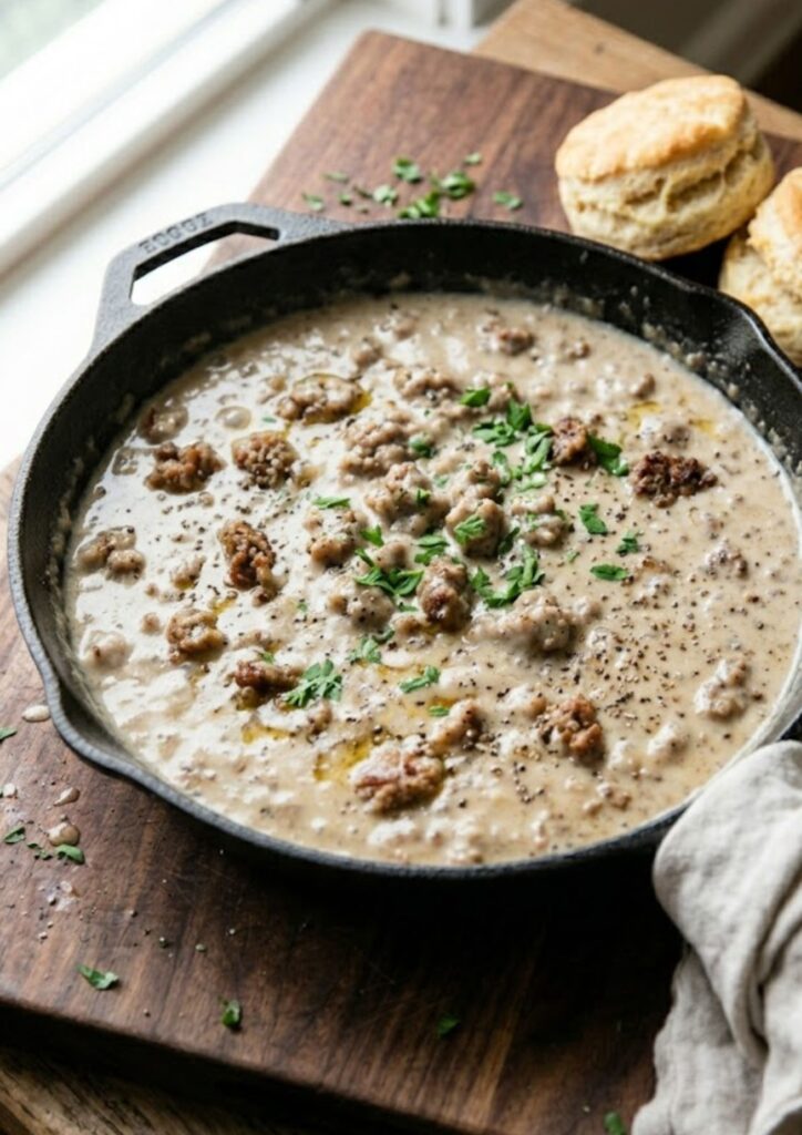 Alton Brown’s take on this Southern Sausage Gravy is all about the ratios. While many recipes guess at the amounts, Alton treats this like a savory béchamel. By using exactly two tablespoons of the rendered sausage fat to build your roux, you ensure the gravy is thick enough to coat a spoon (and a biscuit) without being unpleasantly greasy.