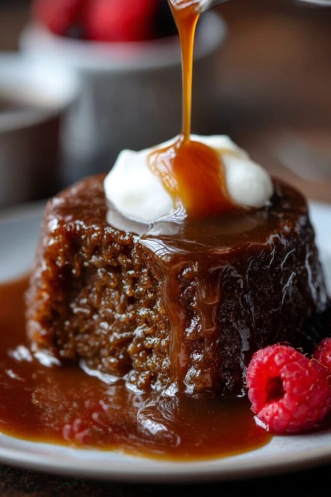 Serve the warm cake with the remaining sauce poured over each individual slice. Letting it sit for five minutes before cutting helps the crumb firm up enough to hold its shape under the weight of the extra topping.