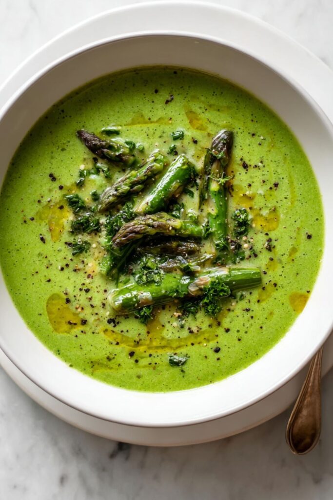 This silky Asparagus Soup is a vibrant, emerald-green celebration of spring. By utilizing fresh spinach to enhance the color and quickly simmering the vegetables, it preserves the delicate, earthy flavor of the asparagus without turning dull or bitter. It is a light, elegant starter finished with buttery, pan-fried asparagus tips for a beautiful textural contrast.