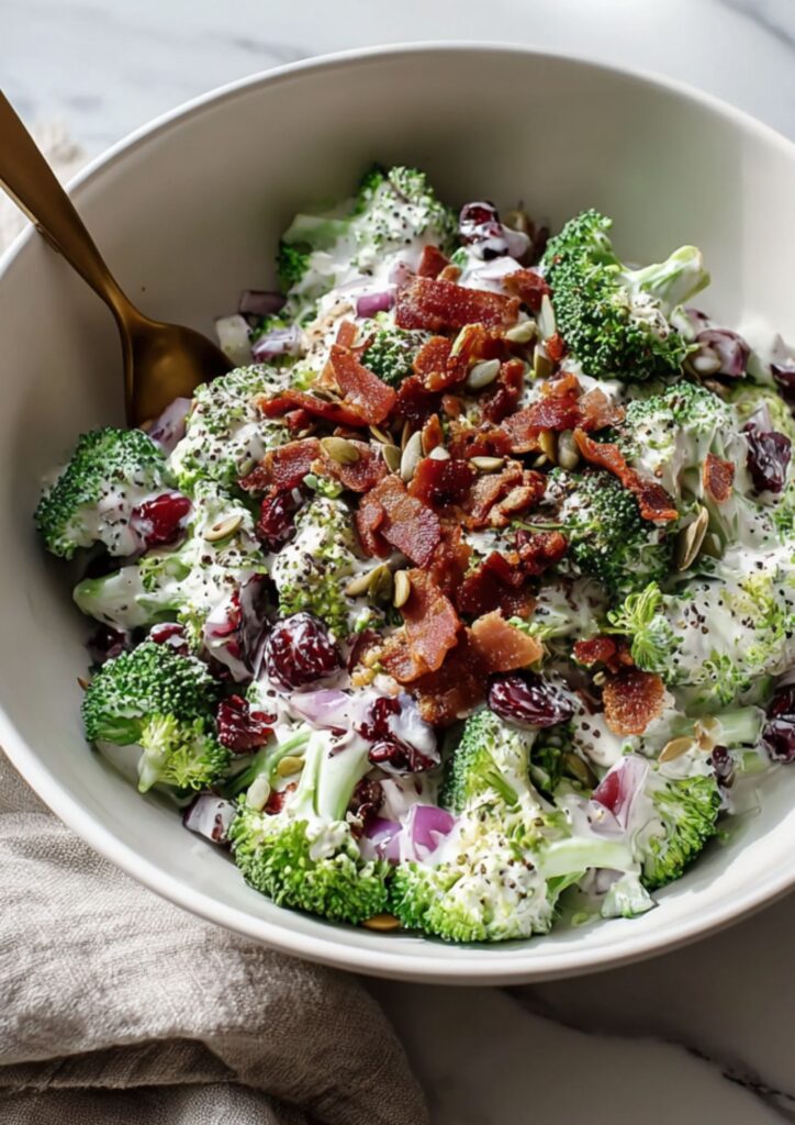 Gordon Ramsay Broccoli Salad is a vibrant, textured side dish that balances the crunch of raw broccoli with smoky bacon, sweet cranberries, and nutty sunflower seeds. The salad is tied together with a tangy, creamy emulsion of mayonnaise, sour cream, and apple cider vinegar. By cutting the florets into marble-sized pieces and allowing the salad to macerate in the fridge, the broccoli softens slightly and fully absorbs the dressing, creating a perfectly balanced bite of acidity, salt, and sweetness.