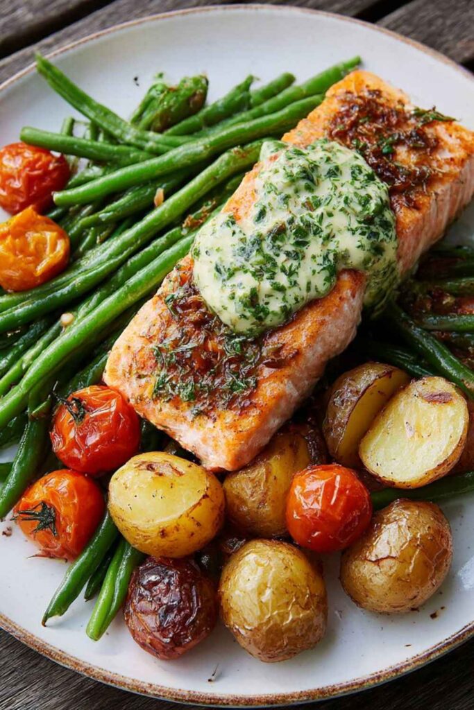 - Rest and Serve: Let the salmon rest on the tray for 3–5 minutes after removing it from the oven. To serve, plate the crispy smashed potatoes and vegetables, top with a salmon fillet, and spoon the cool green sauce over the top.