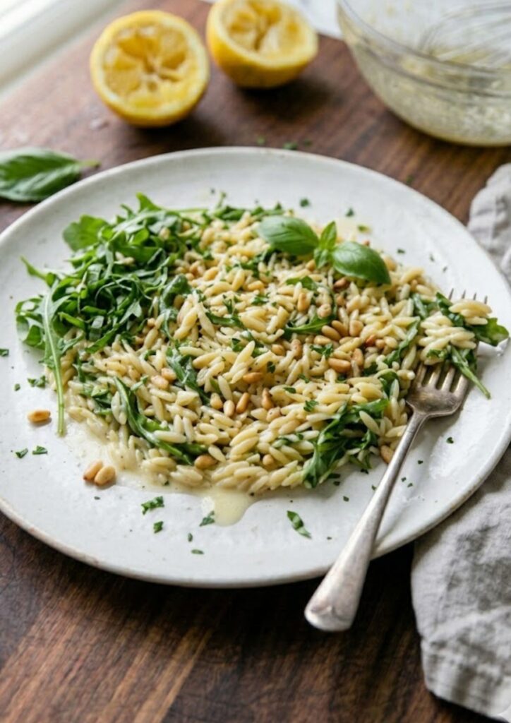 - The Assembly: Toss the still-warm orzo into the dressing bowl. Fold in the rocket, basil, and toasted pine nuts. Serve immediately while the flavors are vibrant.