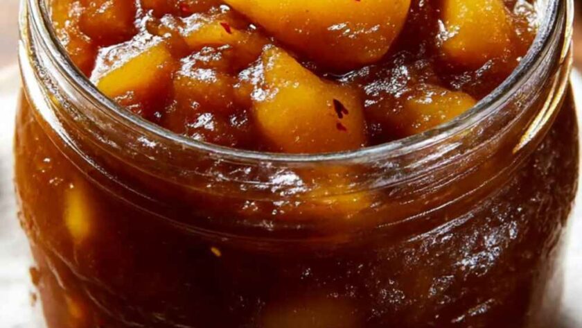 A golden and fragrant chutney made with soft pears, apples, and warm spices like saffron and ginger, slow-simmered into a rich, sweet, and tangy preserve.