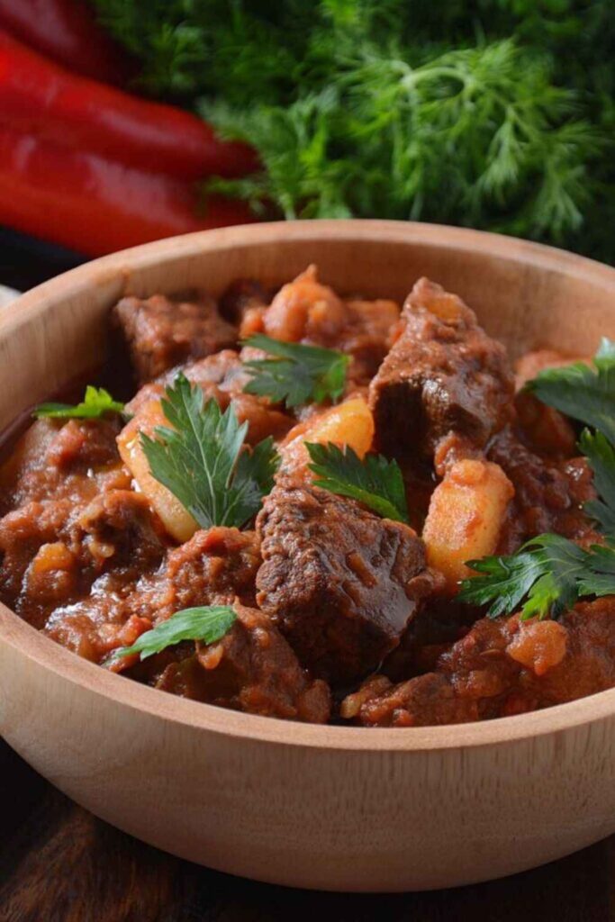 Rich beef stew layered with smoky paprika, sweet peppers, and just enough vinegar to keep it balanced.