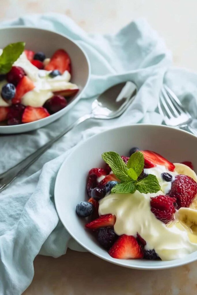 - Assemble and serve: Spoon fruit mixture into serving bowls, top with lemon yogurt, and garnish with mint. Serve immediately.