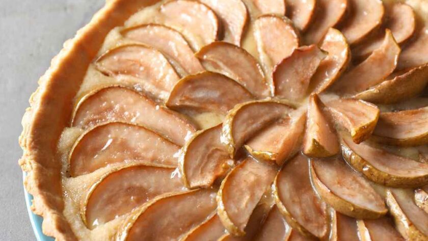 - Assemble the tart: Arrange the pear slices in a spiral pattern over the crust. Sprinkle the crumb topping evenly over the fruit.
