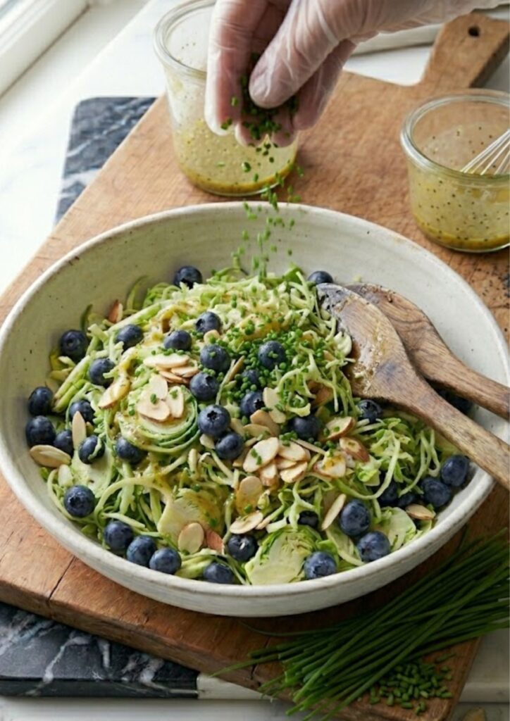 This Joanna Gaines-style Brussels Sprout Salad is a masterclass in modern farmhouse cooking—fresh, textural, and surprisingly vibrant. By shredding the sprouts into fine ribbons and allowing them to quick-pickle in a rice vinegar and poppy seed dressing, the vegetable loses its bitter reputation and takes on a tender, slaw-like consistency. The addition of fresh blueberries and toasted almonds creates a sophisticated sweet-and-savory crunch that makes this a standout side dish for any season.