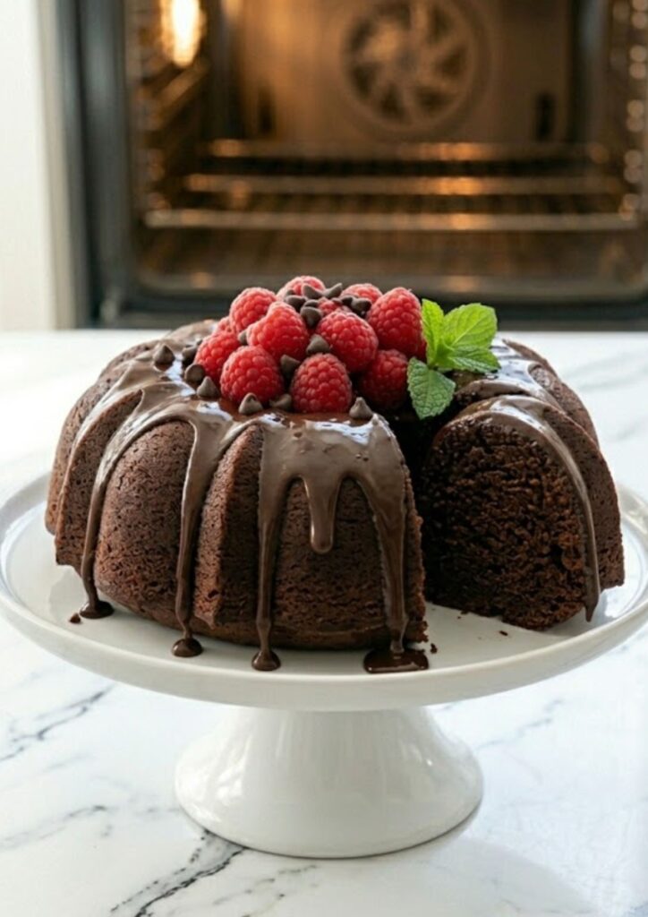 Joanna Gaines Chocolate Bundt Cake is a decadent American comfort dessert. This moist, dark sponge is infused with a hint of cinnamon and loaded with mini chocolate chips before being draped in a silky, two-ingredient chocolate ganache.