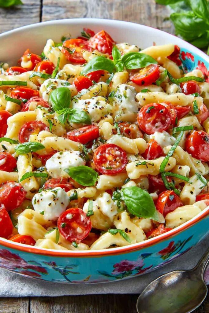 A simple, fresh, and vibrant pasta salad that captures all the classic flavors of a Caprese salad with juicy tomatoes, fresh mozzarella, and basil.