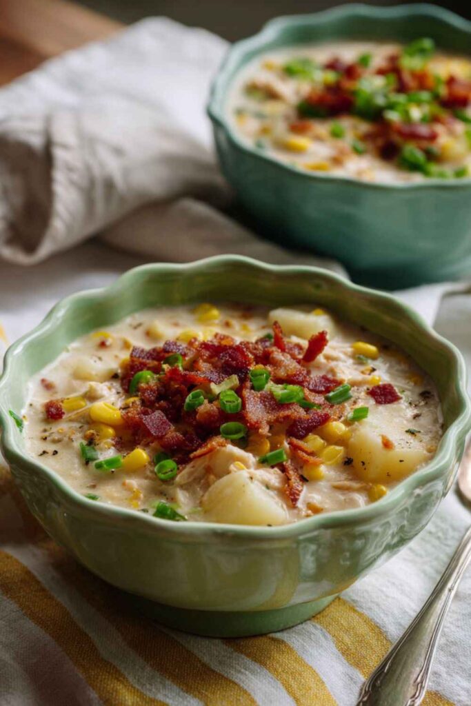 A rich, creamy, and comforting chowder packed with tender chicken, sweet corn, potatoes, and topped with crispy bacon.