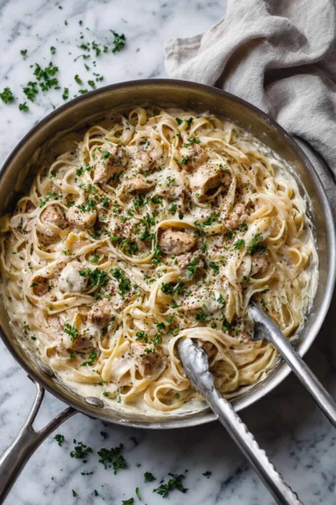 - 7. Toss everything together: Add the cooked fettuccine and the browned chicken back into the skillet with the sauce. Pour in a splash of the saved pasta water and toss it all with tongs until the noodles are completely coated.