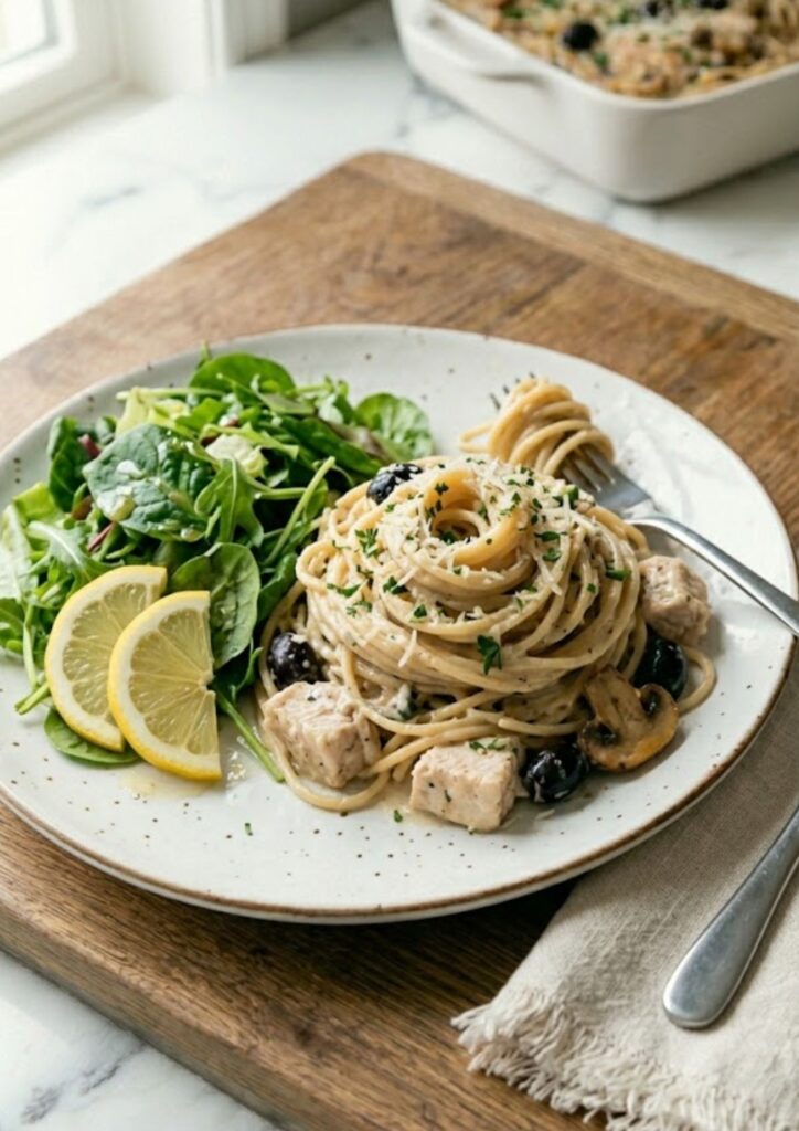 - Combine the casserole: Remove the skillet from the heat. Stir in the grated Parmesan until melted. Add the shredded chicken, sautéed mushrooms, and chopped olives. Taste and adjust the salt and pepper. Gently fold the cooked spaghetti into the sauce until every strand is coated.