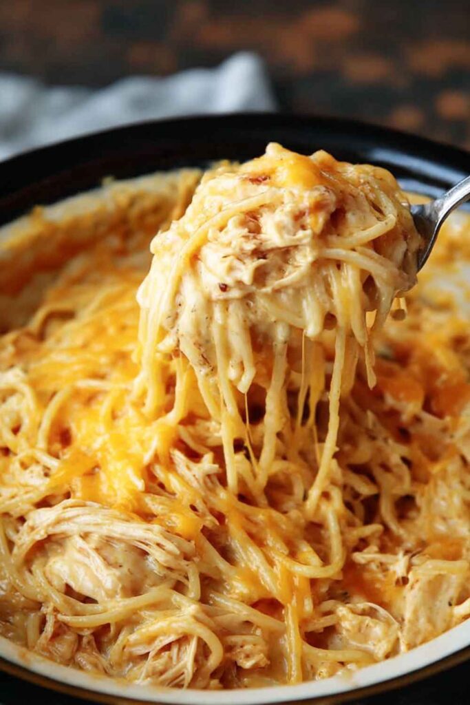 The ultimate cheesy comfort food, this slow cooker chicken spaghetti combines tender chicken in a creamy Velveeta sauce, all made easy in the crock pot.