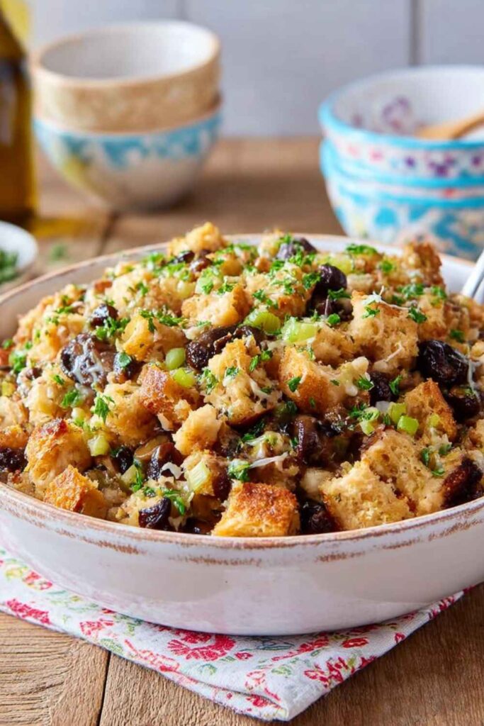 A classic, savory holiday side dish made easy in the slow cooker, featuring mushrooms, fresh herbs, and a moist, flavorful texture.