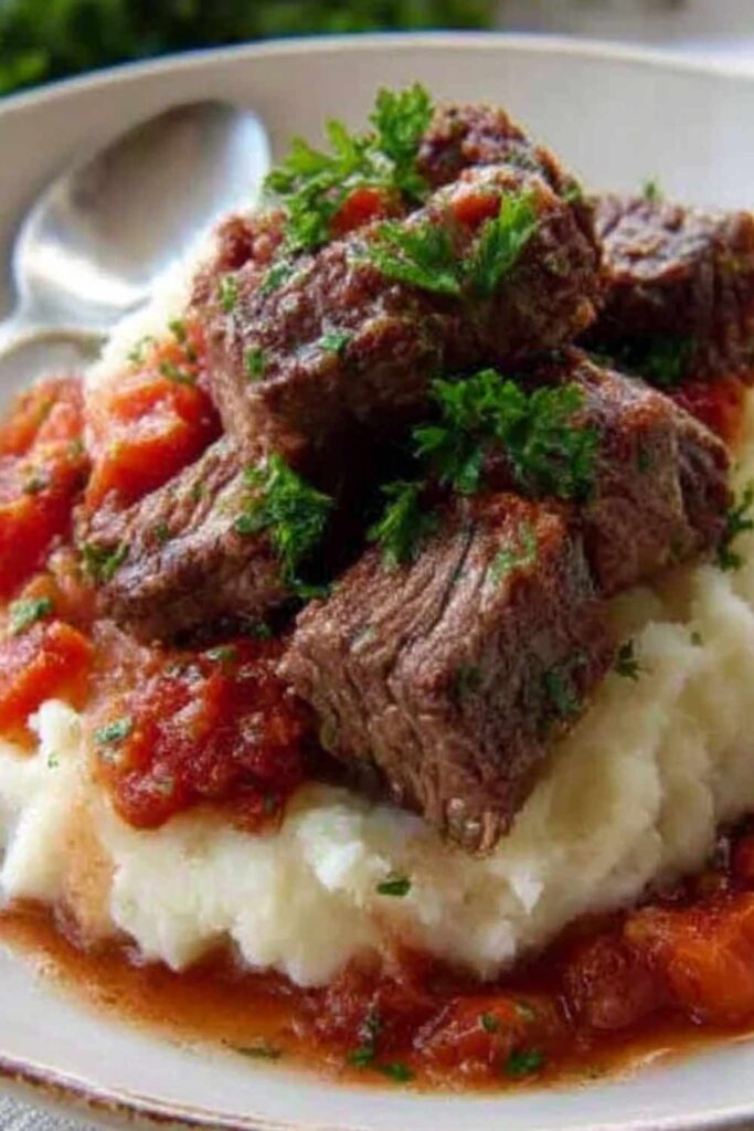 A classic comfort food dish featuring fall-apart tender round steak and vegetables slow-cooked in a rich and savory tomato gravy.