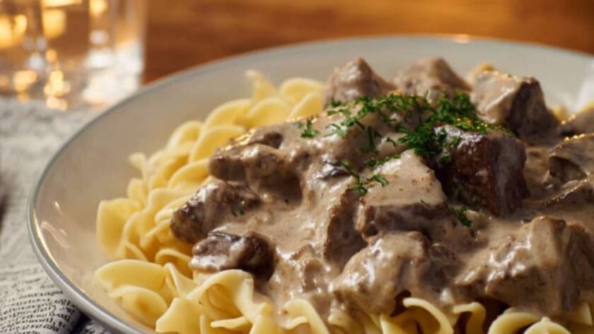 - Serve: Serve the hot beef stroganoff immediately over a bed of cooked egg noodles.