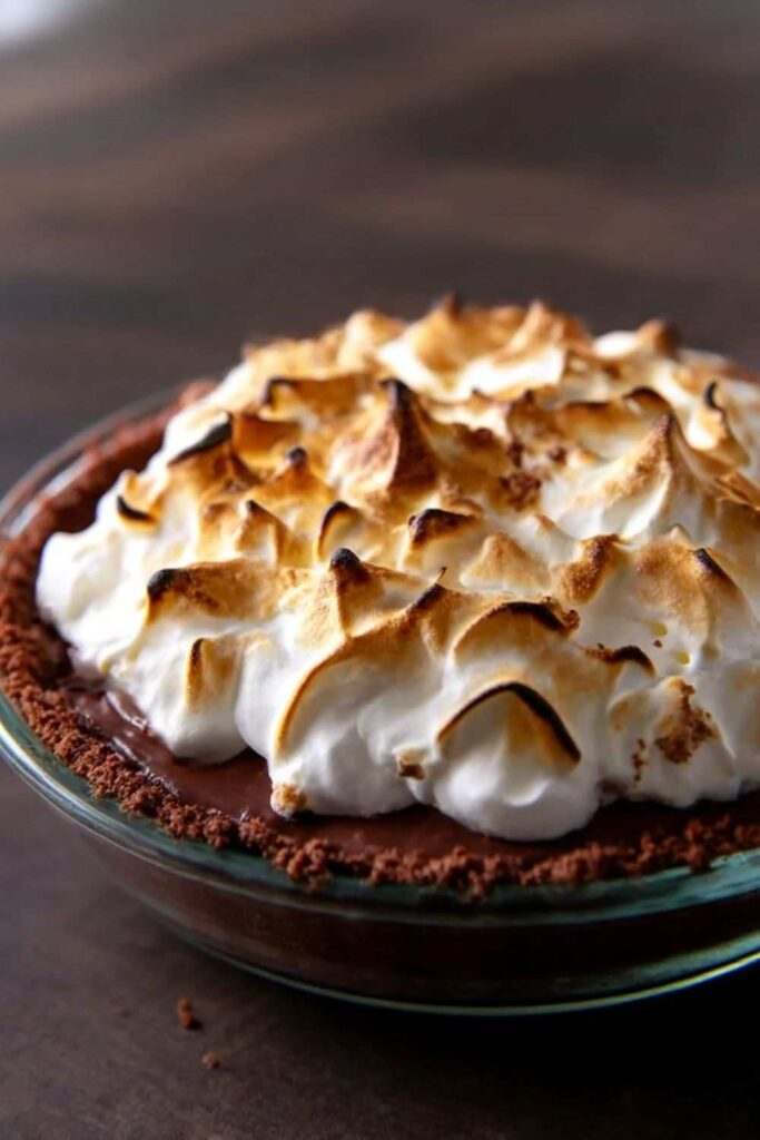 A decadent, triple-layer dessert featuring a crisp chocolate graham cracker crust, a rich and creamy homemade chocolate pudding filling, and a fluffy, toasted marshmallow-like meringue topping.