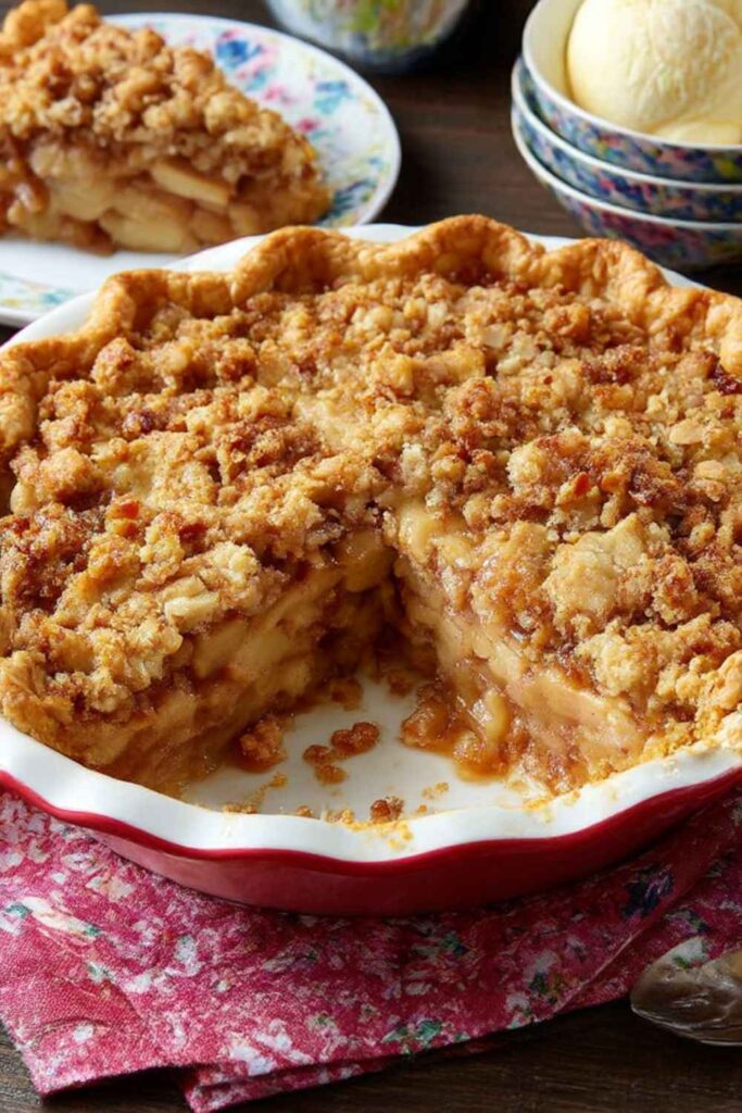 A creamy apple pie with tart Granny Smith apples in a rich, spiced filling, topped with a buttery pecan crumble, served with ice cream or whipped cream.