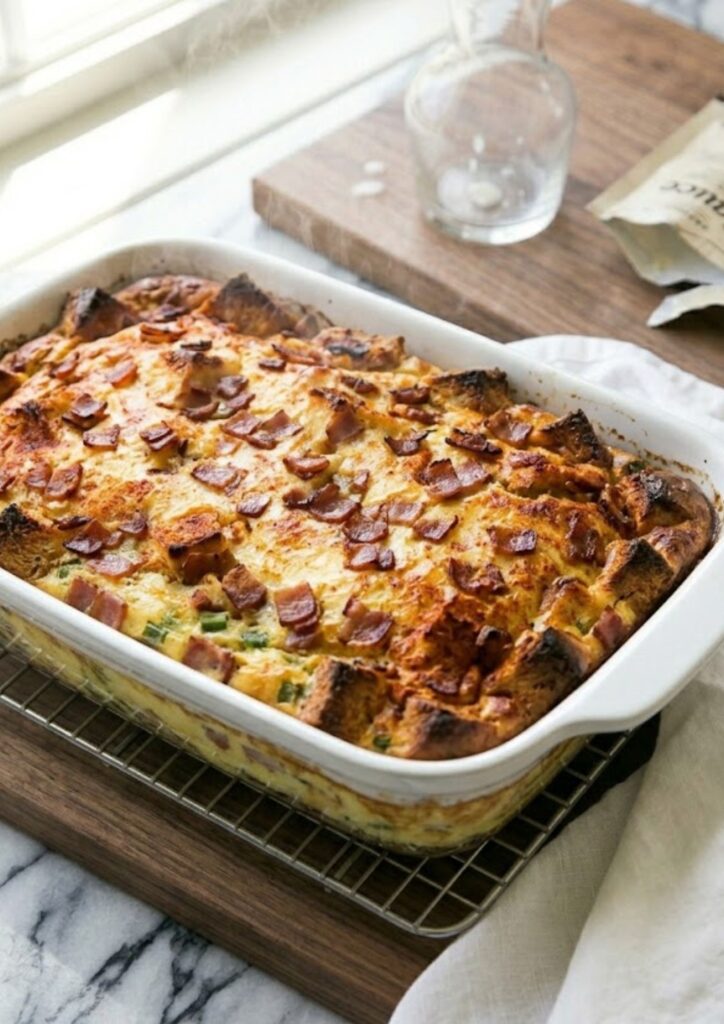 - 3. Overnight Rest: Cover tightly with plastic wrap and refrigerate for at least 8 hours (or up to 24 hours). This “strata” method is what gives the dish its signature texture.