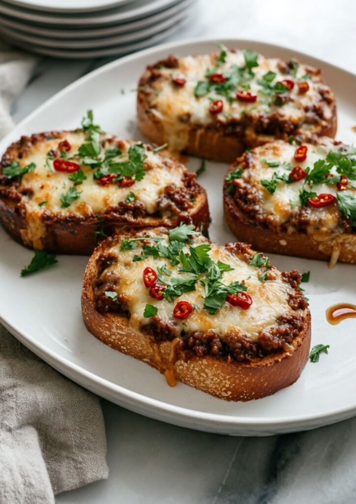 Pioneer Woman Garlic Bread Sloppy Joes is a bold, spicy twist on the classic American comfort sandwich, replacing traditional buns with buttery, toasted garlic bread. The hearty filling features ground beef simmered in a complex sauce of ketchup, balsamic glaze, and a “triple-threat” chile blend of jalapeño, Fresno, and serrano peppers. Finished under the broiler with a double layer of melted provolone cheese, these open-faced sandwiches offer a perfect balance of garlicky crunch, savory beef, and a lingering peppery heat.