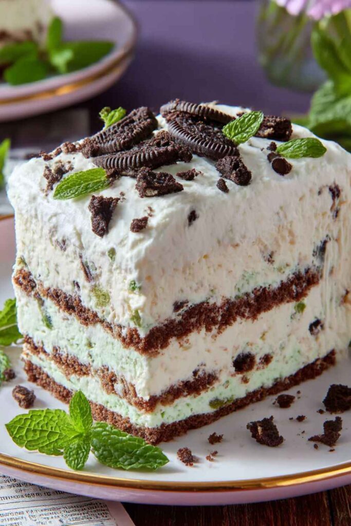 - u003cliu003eSoften the ice cream for about 15 minutes at room temperature to make it easily spreadable.u003c/liu003eu003cliu003eLining the pan is crucial for easily removing the cake to frost and serve it.u003c/liu003eu003cliu003eUse a hot, dry knife to make clean cuts when serving.u003c/liu003eu003cliu003eFeel free to swap the mint chip ice cream and cookies for any flavor combination you love.u003c/liu003e