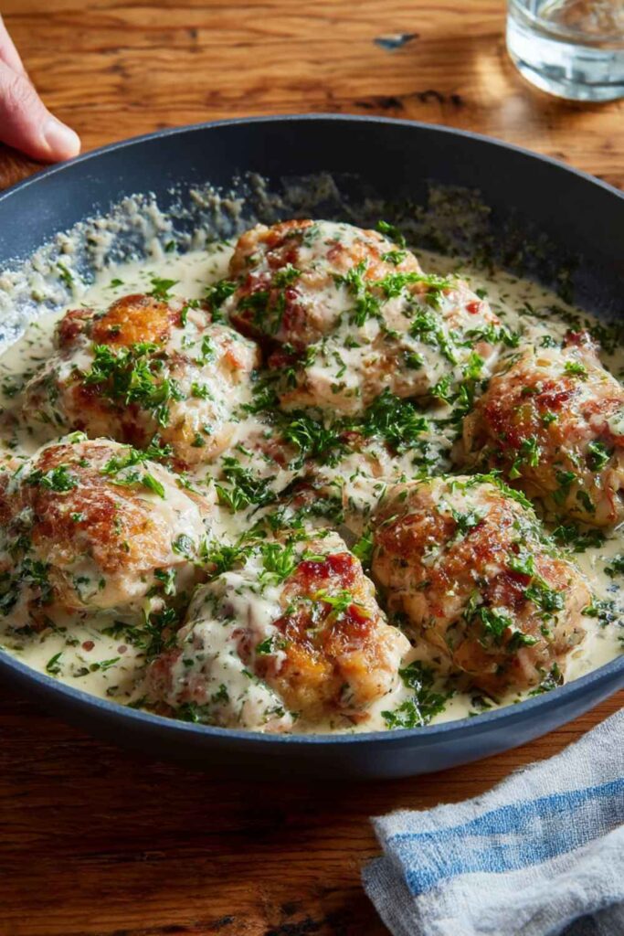 - u003cliu003eUsing chicken thighs ensures the meat stays juicy and tender.u003c/liu003eu003cliu003eDon’t let the cream sauce boil rapidly, as this can cause it to separate.u003c/liu003eu003cliu003eThe fresh herbs at the end add a bright, fresh flavor that cuts through the richness of the cream sauce.u003c/liu003eu003cliu003eScraping the browned bits from the bottom of the pan (the u0022fondu0022) is key to a flavorful sauce.u003c/liu003e