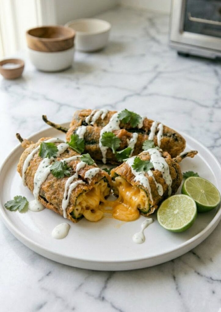 Pioneer Woman Mac and Cheese Stuffed Peppers are a classic American appetizer featuring roasted poblanos filled with creamy pasta. These deep-fried treats use pepper jack and processed cheese for a smooth melt, finished with a zesty cilantro-lime cream.