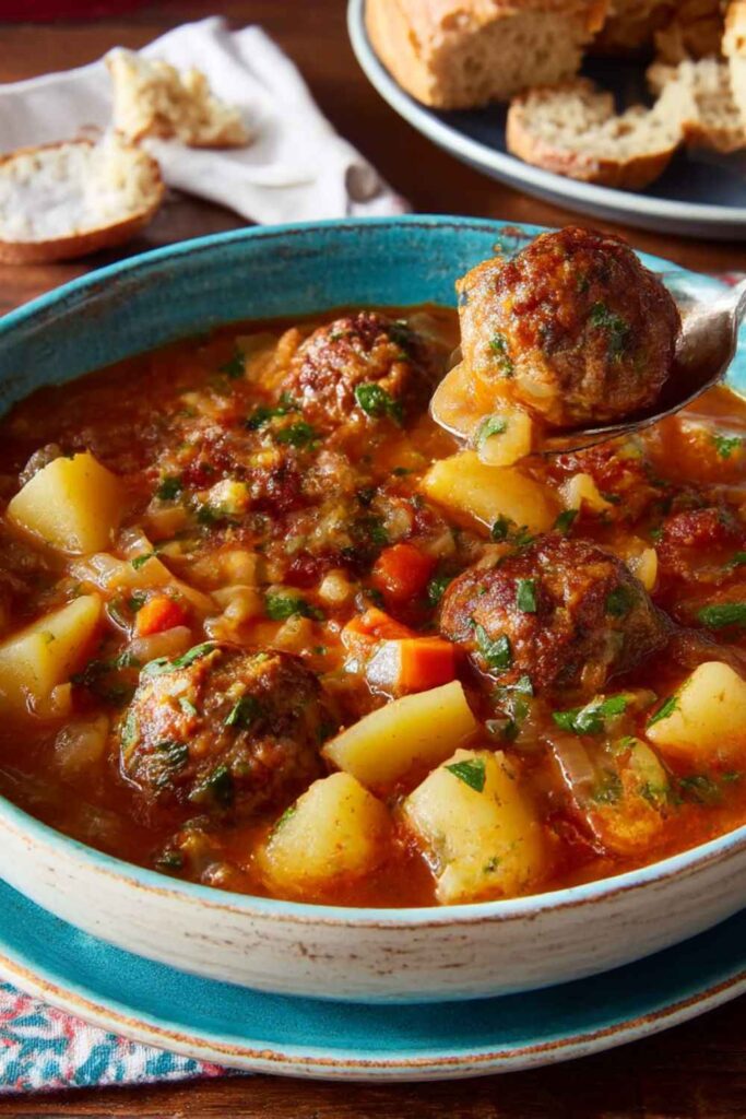 A hearty and comforting soup packed with tender homemade meatballs, vegetables, and cabbage in a rich, savory broth.