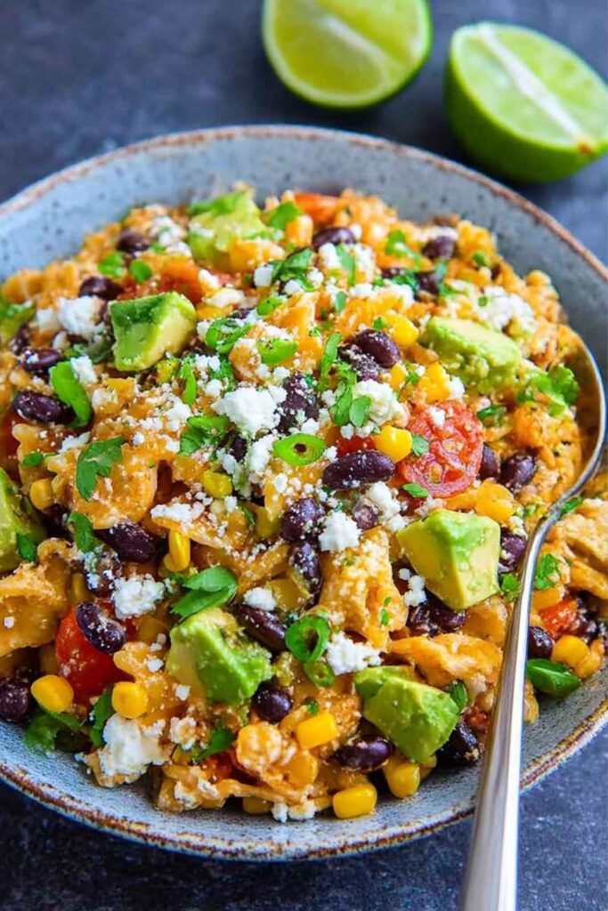 A vibrant and creamy Mexican pasta salad loaded with corn, black beans, and avocado, all tossed in a zesty Southwestern Greek yogurt dressing.