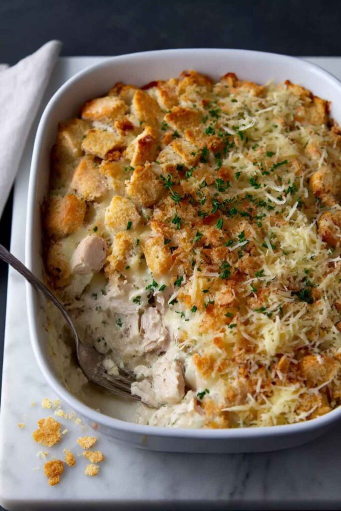 An ultra-rich and creamy casserole loaded with tender rotisserie chicken in a decadent four-cheese sauce, all topped with a buttery, crisp cracker crust.