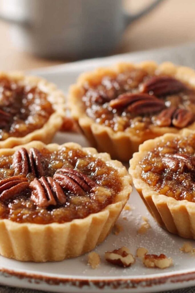 - Assemble the Pies: Divide the chopped pecans evenly among the mini pie shells. Slowly pour the syrup mixture over the top of the pecans in each shell.