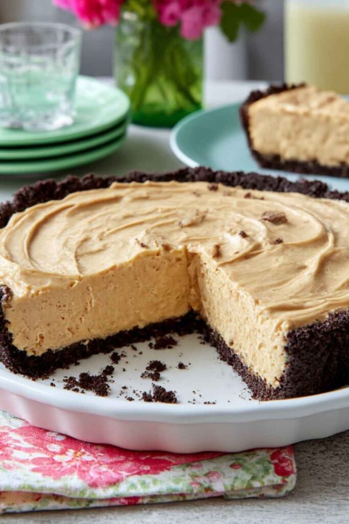 A rich and decadent no-bake peanut butter pie with a creamy, fluffy filling made from cream cheese and peanut butter, all in a crisp Oreo cookie crust.