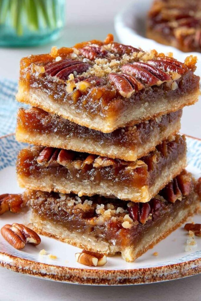 The main difference is the crust. Pecan pie is made in a traditional flaky pastry pie crust, while pecan bars are made on a sturdy, buttery shortbread crust, which makes them easy to cut and serve as a handheld treat.