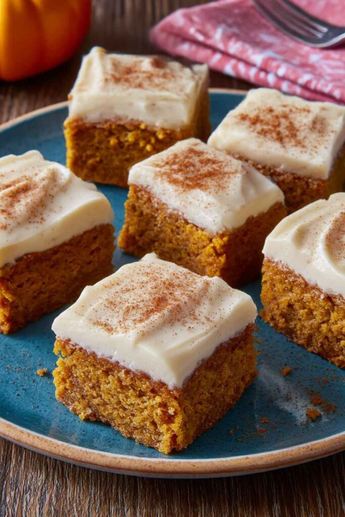 - Frost and Serve: Spread the spiced cream cheese frosting evenly on top of the cooled pumpkin cake. Cut into squares and serve.