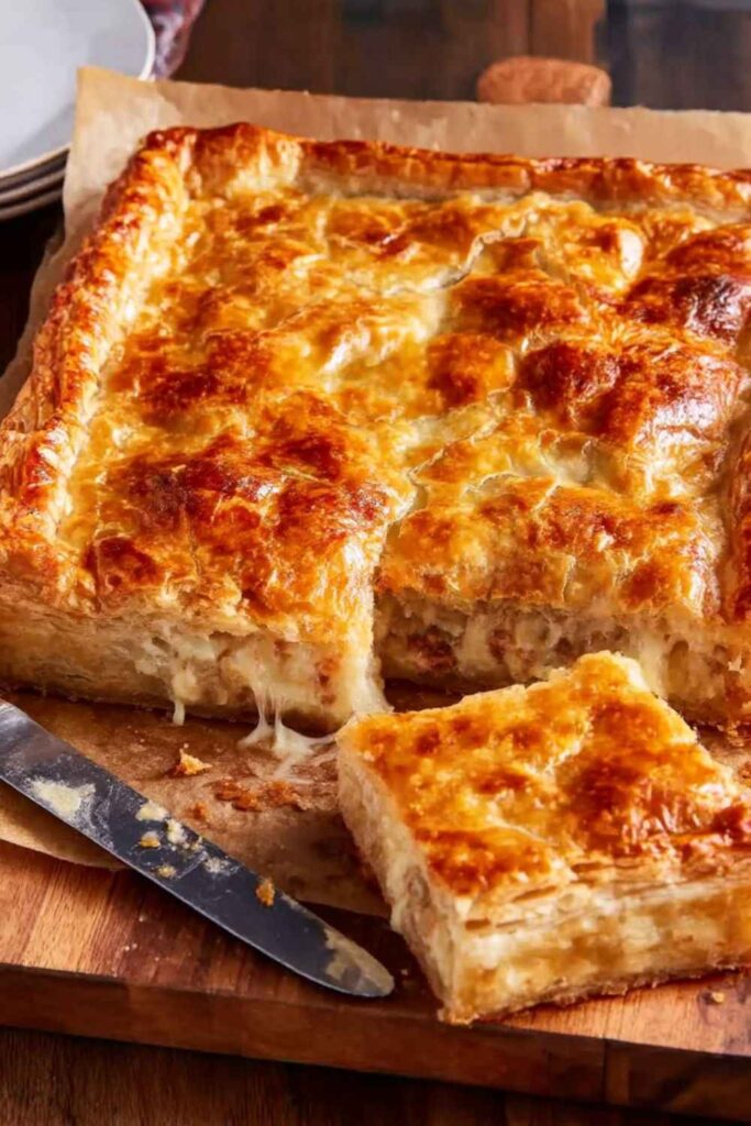 A savory pizza pie with flaky puff pastry, filled with caramelized onions, bell peppers, breakfast sausage, pepperoni, and cheeses, perfect for a hearty meal.