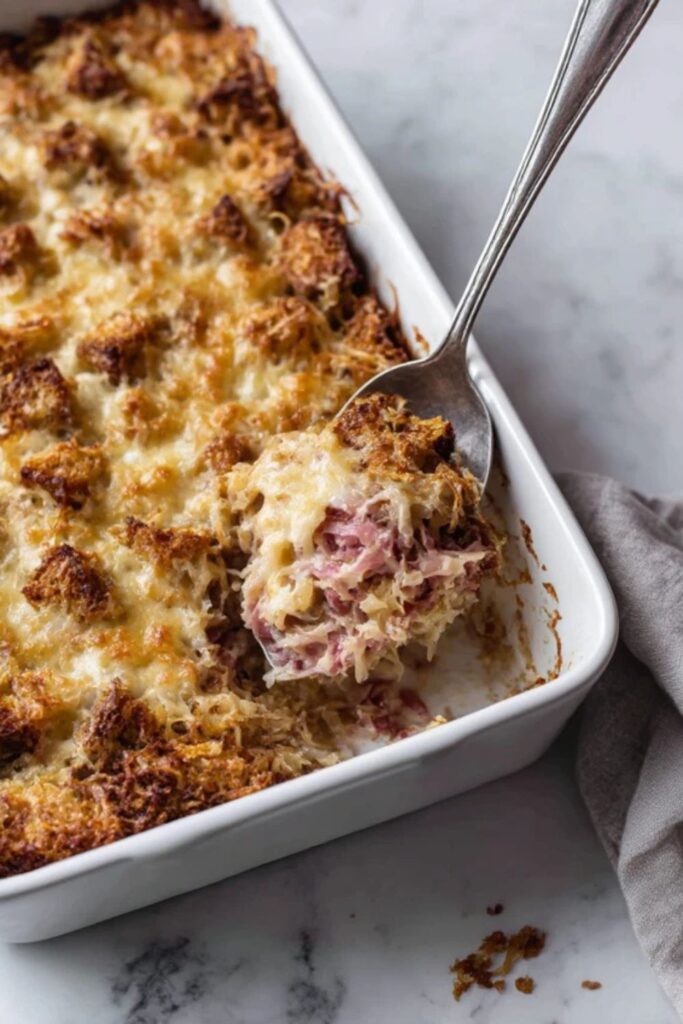 Pioneer Woman Reuben Casserole is a savory American dinner that layers marble rye bread with corned beef and sauerkraut. Swiss cheese and creamy Russian dressing tie everything together for a filling family meal.