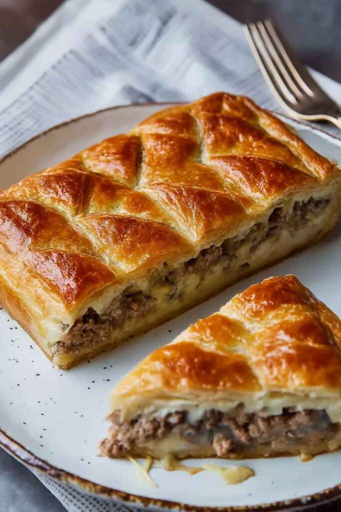 An easy, cheesy, and hearty one-dish meal with all the classic flavors of a Midwestern Runza, featuring layers of a savory ground beef and cabbage filling baked between two flaky crescent roll crusts.