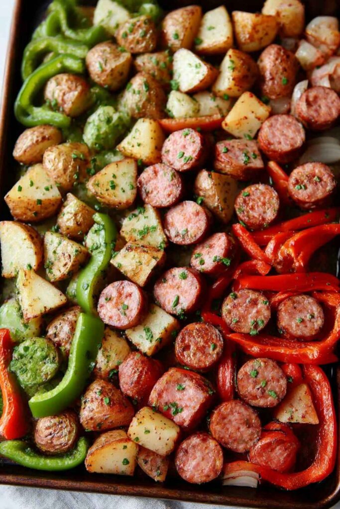 An incredibly easy, Italian-inspired one-pan meal featuring smoked sausage, tender baby potatoes, and colorful bell peppers, all roasted together with savory seasonings for the perfect weeknight dinner.