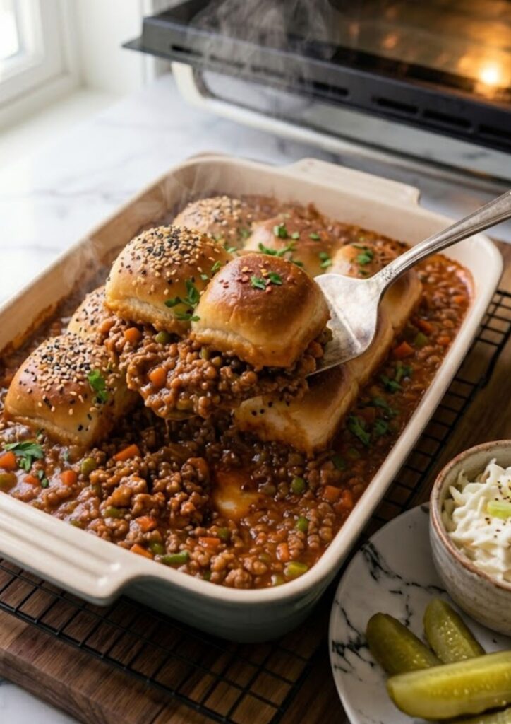 The Pioneer Woman’s Sloppy Joe Casserole is a clever, “one-pan” twist on the American lunchroom classic. By nesting whole slider rolls directly into a rich, vegetable-packed beef base, Ree Drummond transforms a messy handheld sandwich into a cozy, bakeable family dinner that stays warm from the first scoop to the last.