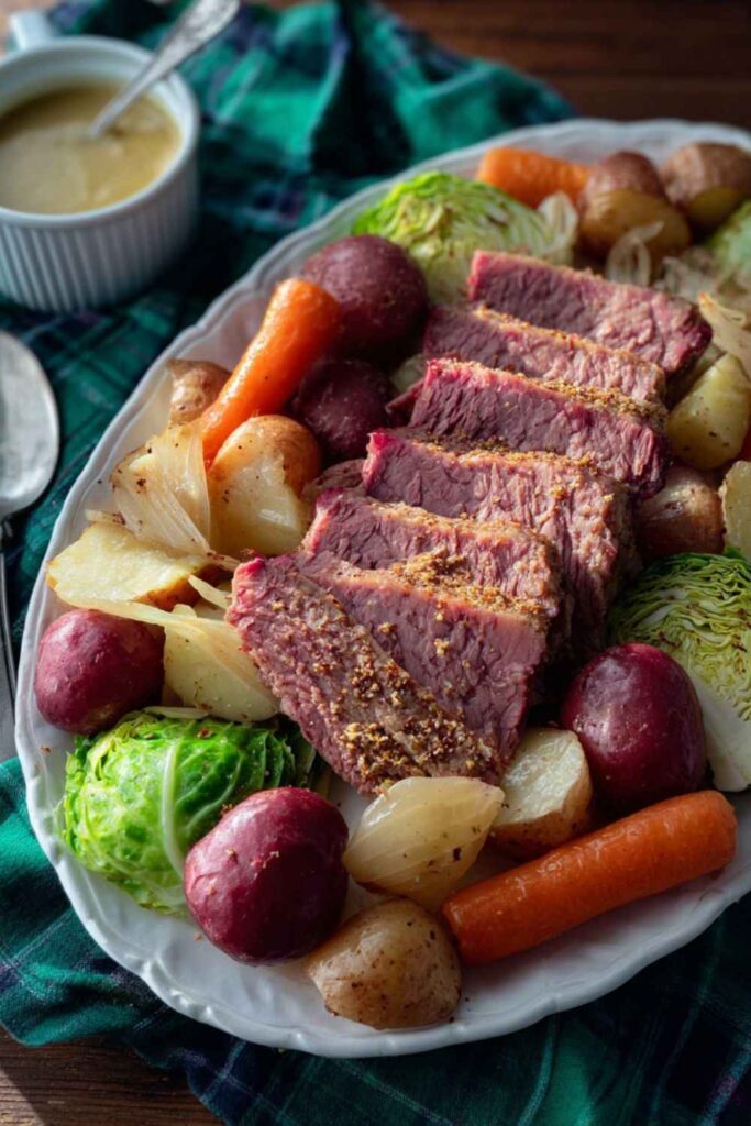 - Serve: Carefully remove the corned beef and vegetables from the slow cooker. Slice the corned beef against the grain and serve it with the cooked vegetables and a side of the honey mustard sauce.