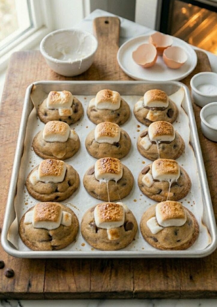 Pioneer Woman S’mores Cookies are a nostalgic American dessert snack. Melted butter, honey, and graham cracker crumbs create a chewy base loaded with milk chocolate chips and topped with a toasted, gooey marshmallow half.