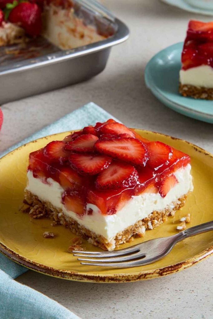 A classic layered dessert with a salty pretzel crust, a creamy sweet cream cheese filling, and a fruity strawberry gelatin topping.