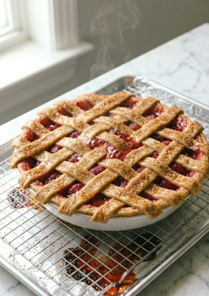 Use a hot baking sheet: Putting the pie directly onto a preheated tray helps cook the bottom crust faster. This prevents the “soggy bottom” problem that often happens with high-moisture fruit pies like strawberry and rhubarb.