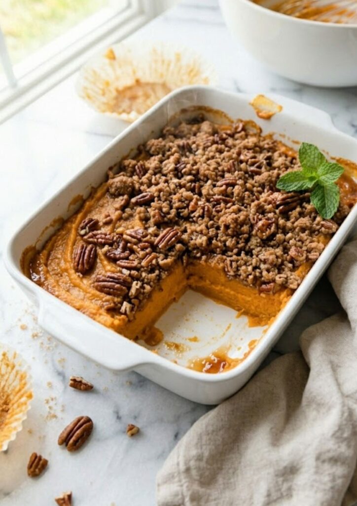 - Keep the topping crunchy: If you like an extra-crunchy top, toast your chopped pecans in a dry pan for 2–3 minutes before mixing them into the topping.