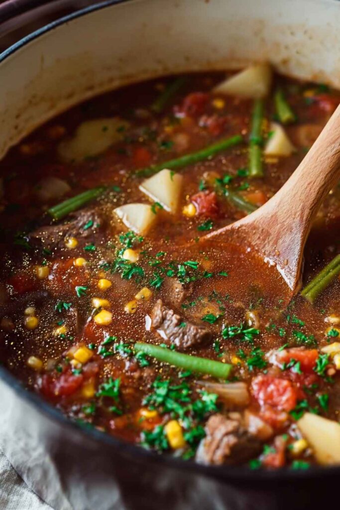 - Finish the Soup: Add green beans (if not already added) and cook for another 15 minutes, until all vegetables and beef are tender. Stir in corn and peas, cooking 5 minutes more until heated through.