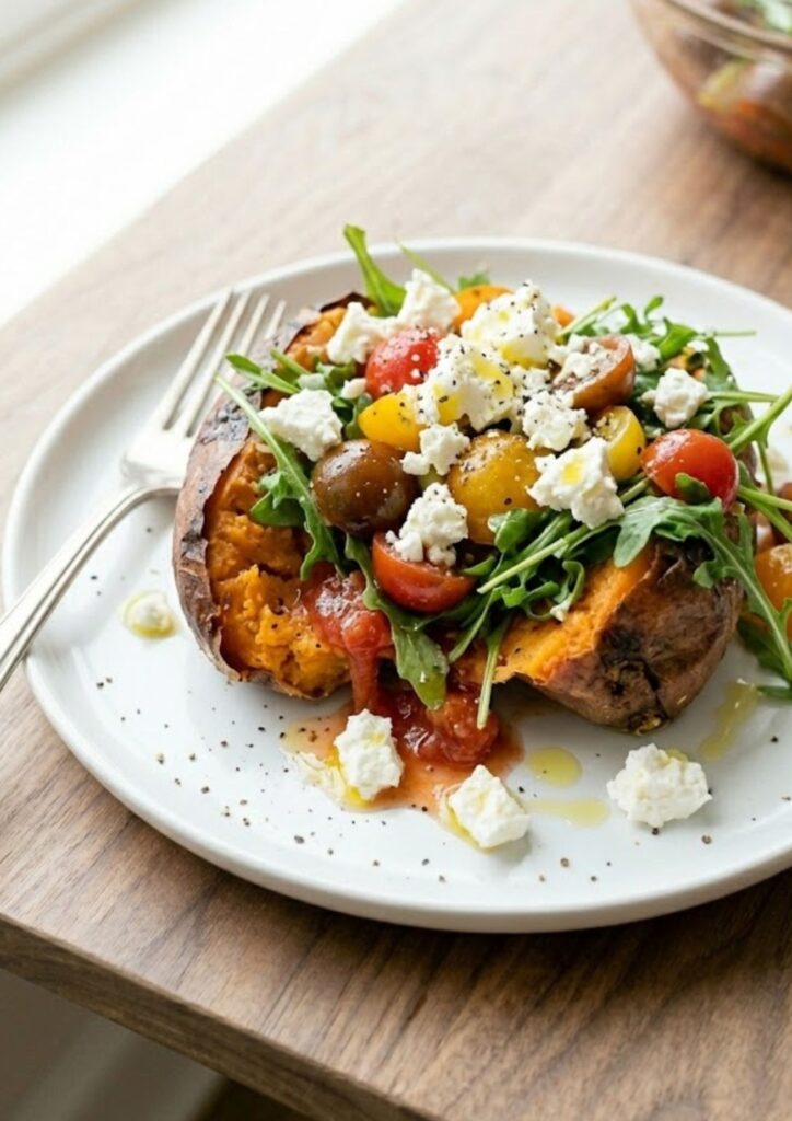 - 5. Add Toppings: Gently toss the rocket into the tomato and onion mixture. Pile this over the hot sweet potatoes, ensuring the tomato juices run down into the flesh. Crumble the feta cheese over the top, finish with a final drizzle of olive oil, and a good crack of black pepper.